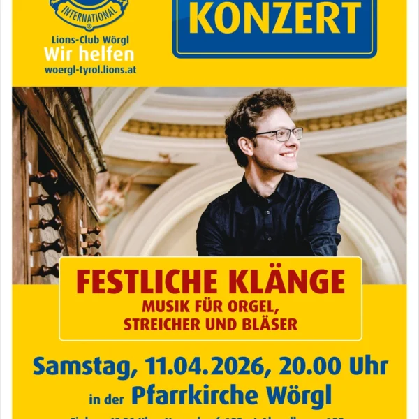 Der Lions Club Wörgl lädt herzlich zu einem festlichen Konzert am Samstag, 11. April 2026, um 20:00 Uhr in die Stadtpfarrkirche Wörgl ein. Freuen Sie sich auf eine inspirierende musikalische Reise durch verschiedene Epochen und Stilrichtungen. Es erklingen Werke von Cesare Bendinelli, Wolfgang Amadeus Mozart, Jacques Dancian Philidor, Felix Mendelssohn Bartholdy, Johann Sebastian Bach, Johann …