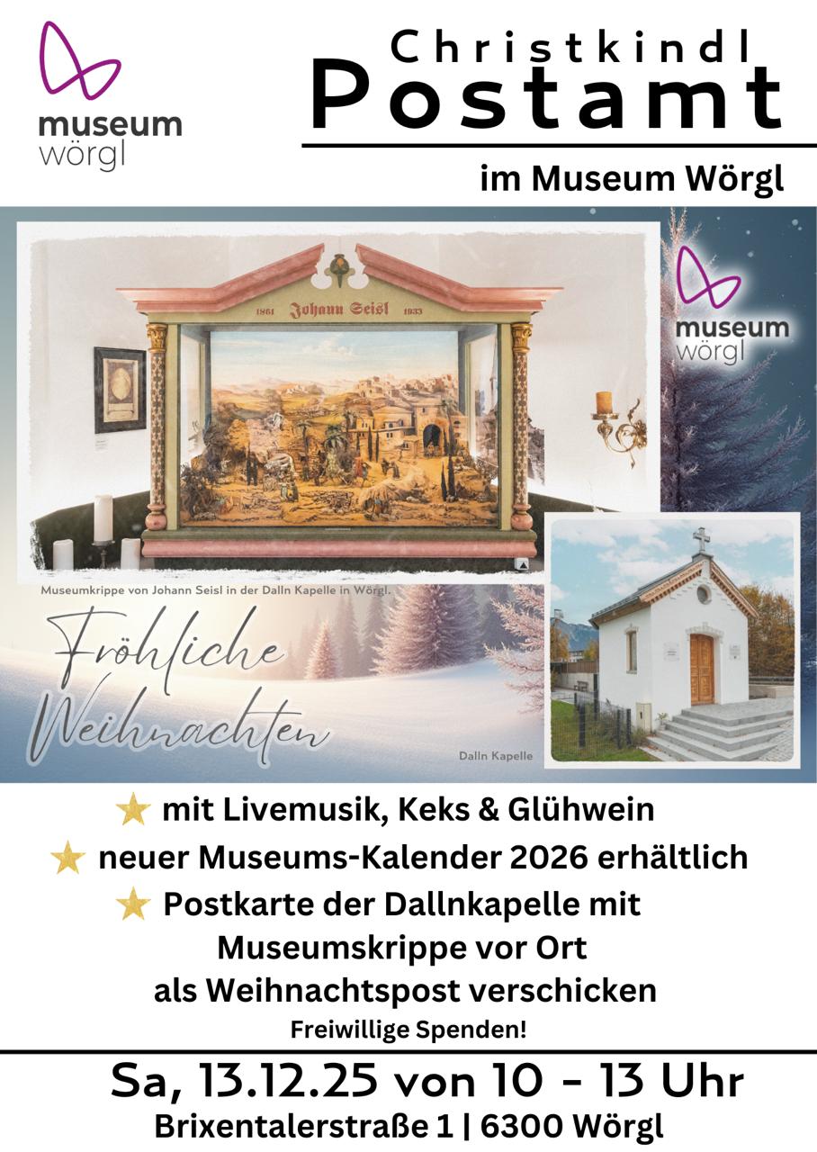 Im Museum Wörgl öffnet am Samstag, 13. Dezember 2025, von 10 bis 13 Uhr erstmals das Christkindl-Postamt. BesucherInnen können eine neu gestaltete Postkarte der Dallnkapelle mit der Museumskrippe von Johann Seisl direkt vor Ort als persönliche Weihnachtspost an Familie und Freunde verschicken.