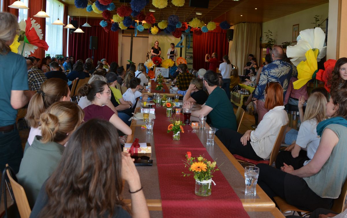 Dem Schulmotto getreu ging das Jubiläumsfest nicht nur im Volkshaus, sondern nach dem Festakt auch unter freiem Himmel über die Bühne. Allerlei Ball- und Geschicklichkeitsspiele auf der großen Wiese, Riesenseifenblasen, Workshops für Zauberei und „Bewegungskünste“ sowie eine Kinderschmink-Station animierten zum Mitmachen. Kulinarisch wurden die Gäste mit einem reichhaltigen Kuchenbuffet und abends mit warmen Speisen vom Buffet verwöhnt, dazu konnte Steckerlbrot am Lagerfeuer gebacken werden. Ein Highlight für viele war zudem die große Tombola mit hunderten Preisen, bei der jedes Los ein Treffer war und „unpassende“ Gewinne gleich beim „Tauschplatzerl“ umgetauscht werden konnten. Live-Musik von Barabara Trixl und Helmut Sprenger sowie der Auftritt von „Clownin Risi“ trugen zum unterhaltsamen Festprogramm bei, das mit dem Verkauf der dekorativen Riesen-Krepp-Papierblumen ausklang.