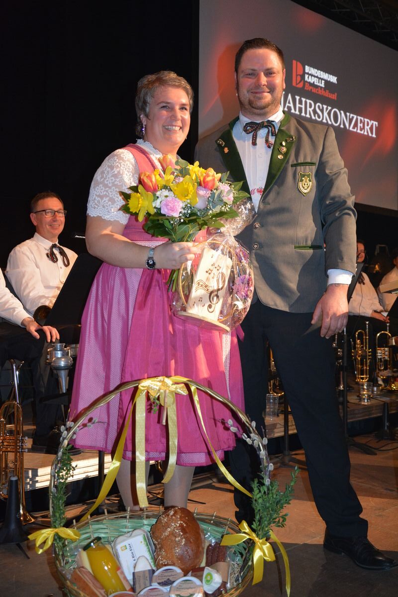 Obmann Martin Gasteiger bedankte sich bei Bezirksjugendrefentin Gloria Marrone, die heuer zum 10. Mal das Frühjahrskonzert der BMK Bruckhäusl moderierte. Foto: Veronika Spielbichler
