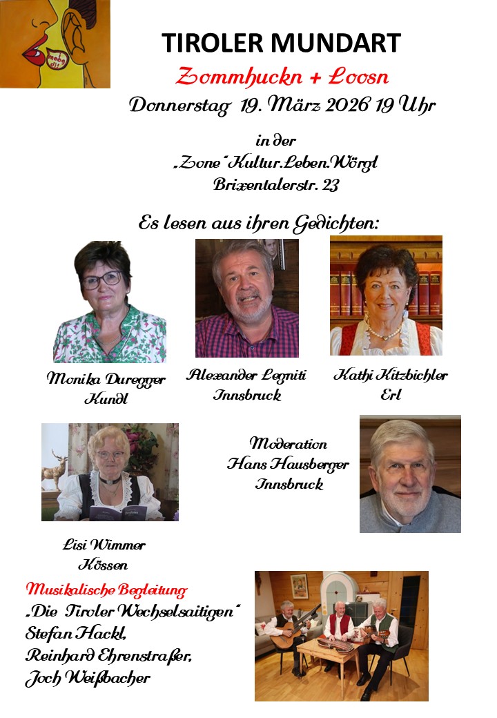 Anders beim Tiroler Mundartabend – Zommhuckn + Loosn am Donnerstag, 19. März 2026 ab 19 Uhr – für die Teilnahme ist eine Reservierung erforderlich unter office@zone-woergl.com oder 0699 / 172 42 113. Den Abend voller Tiroler Lebensgefühl, Humor und Dialektpoesie gestalten diesmal Monika Duregger (Kundl), Alexander Legniti (Innsbruck), Kathi Kitzbichler (Erl) und Lisi Wimmer (Kössen), Moderator ist Hans Hausberger (Innsbruck). Musikalisch begleitet wird der Abend von den „Tiroler Wechselsaitigen“ mit Stefan Hackl, Reinhard Ehrenstraßer und Joch Weißbacher. Ein gemütlicher Abend zum Zommhuckn, Loosn und Lacha – ganz im Zeichen der Tiroler Mundart. Eintritt: Freiwillige Spenden.