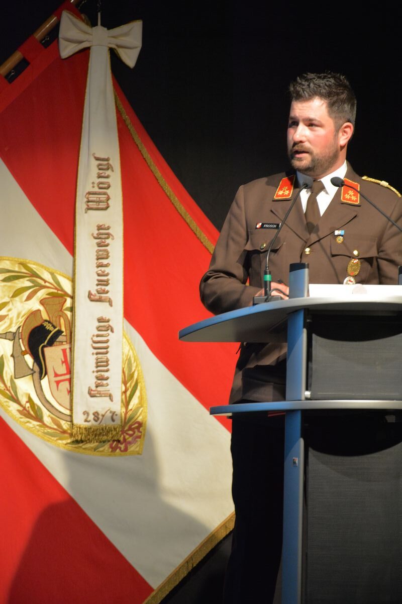 Kommandant Sebastian Prosch begrüßte zur 150. Jahreshauptversammlung der FF Wörgl und betonte: „Kameradschaft verbindet – sie ist das Fundament für eine funktionierende Feuerwehr.“ Foto: Spielbichler