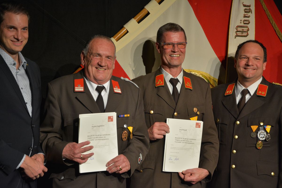 Für 25jährige Mitgliedschaft wurden Christoph Ascher, Stefan Hagleitner, Harald Rieser und Patrik Springer geehrt, für 40jährige Mitgliedschaft Markus Schipflinger und Roman Ehrenstrasser, für 50jährige Rupert Hagleitner und Josef Koidl. Zudem erhielt Josef Koidl, der von 2005-2013 Kommandant war, das Verdienstzeichen des Bezirksfeuerwehrverbandes in Gold.