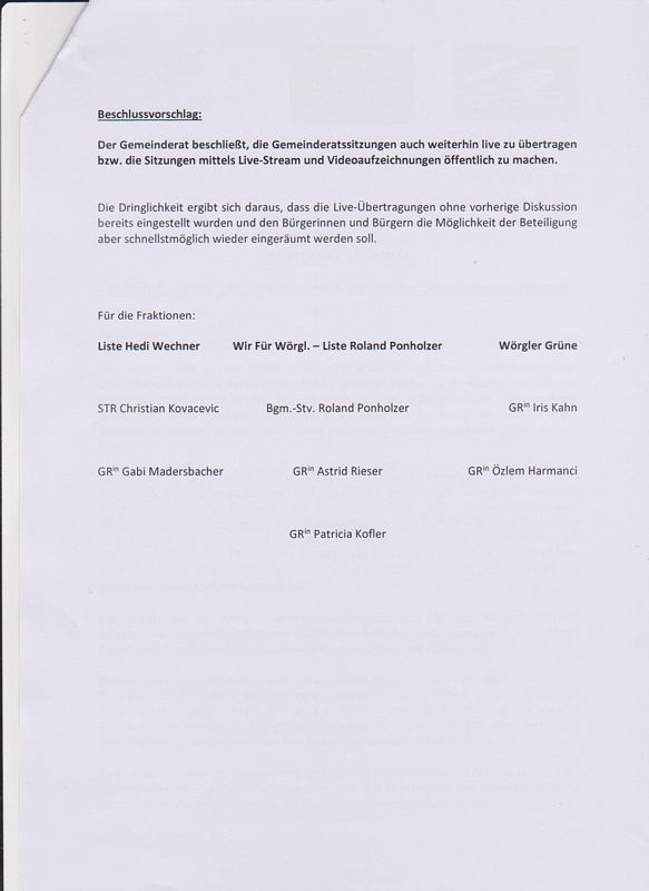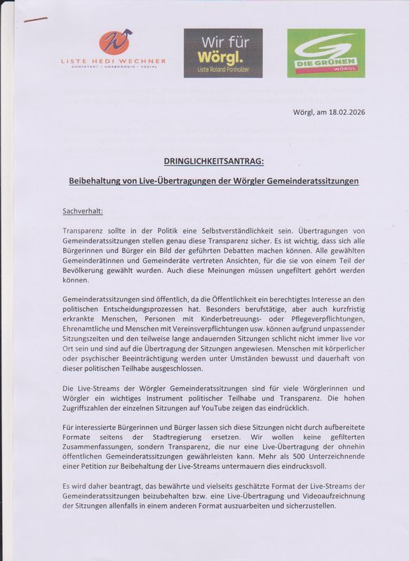 Für die Gemeinderatsfraktionen Liste Hedi Wechner, Wir für Wörgl Liste Roland Ponholzer und die Grünen brachte LA STR Christian Kovacevic zu Sitzungsbeginn einen Dringlichkeitsantrag zur Beibehaltung von Live-Übertragungen und Videoaufzeichnungen der Wörgler Gemeinderatsitzungen ein: „Die Dringlichkeit ergibt sich daraus, dass die Live-Übertragungen ohne vorherige Diskussion bereits eingestellt wurden und den Bürgerinnen und Bürgern die Möglichkeit zur Beteiligung aber schnellstmöglich wieder eingeräumt werden soll“.
