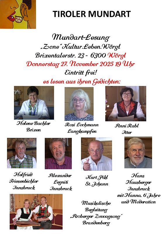 Unter dem Motto „Zommhuckn + Loosn“ lädt die Kulturzone in Zusammenarbeit mit dem Verein Tiroler Mundart am Donnerstag, 27. November 2025, ab  19 Uhr in der Zone – kultur.leben.wörgl zum Tiroler Mundart-Abend mit Dichterlesung.