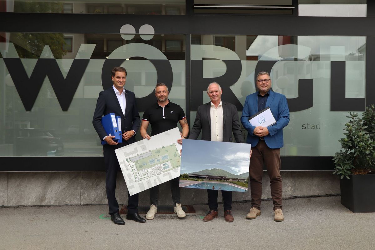 Präsentierten am 5.12.2025 den aktuellen Stand zur Regionalbadplanung – v.l. Bgm. Michael Riedhart, Obmann-Stv. Wörgler Bäderbeirat GR Christopher Lentsch, Obmann Wörgler Bäderbeirat Andreas Schmidt, Stadtbaumeister Dipl.-Ing. Juri Nindl. Foto: Presse Stadtamt Wörgl