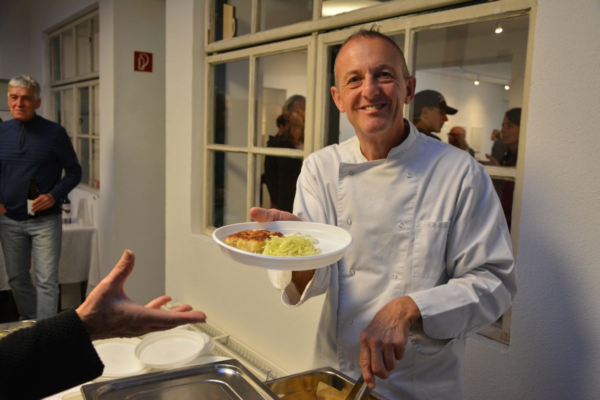 Köstlich wie immer: „Wanderkoch“ Hermann Hörhager verwöhnte das Vernissagenpublikum mit Pressknödel und Krautsalat.