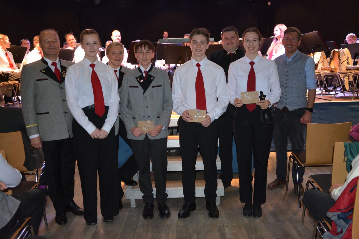 Gratulation zu Jungmusikerleistungsabzeichen – Kapellmeister Johannes Puchleitner, Jugendreferentin Julia Held, Obfrau Maria Scharnagl-Prosch, die drei Ausgezeichneten Patrick Kaltenmarkt, Sebestyen Fülöp und Elena Gruber, hinten Günther Abart/Unterinntaler Musikbund und Kulturreferent Sebastian Feiersinger.