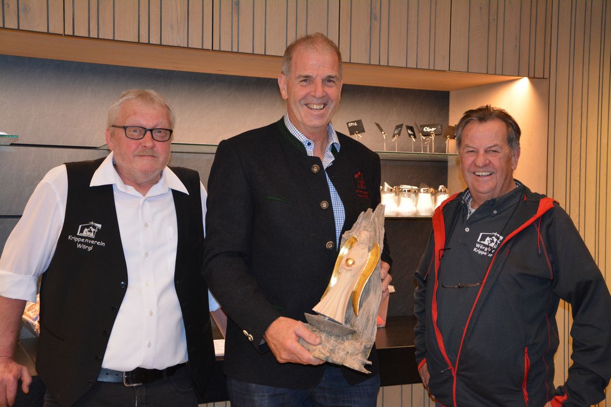 Über einen Engel mit vergoldeten Flügeln, geschnitzt und vergoldet von Peter Werlberger (rechts) vor dem Hintergrund, gestaltet vom Wörgler Krippeler-Obmann Ernst Graus, konnte sich der stellvertretende Landesobmann Alois Aufschnaiter freuen, der seine Funktion nach 15 Jahren niederlegt.