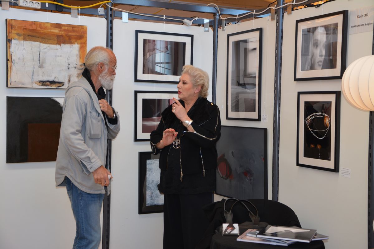 Die Kunstmesse bot vielfach Gelegenheit für angeregte Gespräche wie hier in der Koje von Brigitte Horngacher.