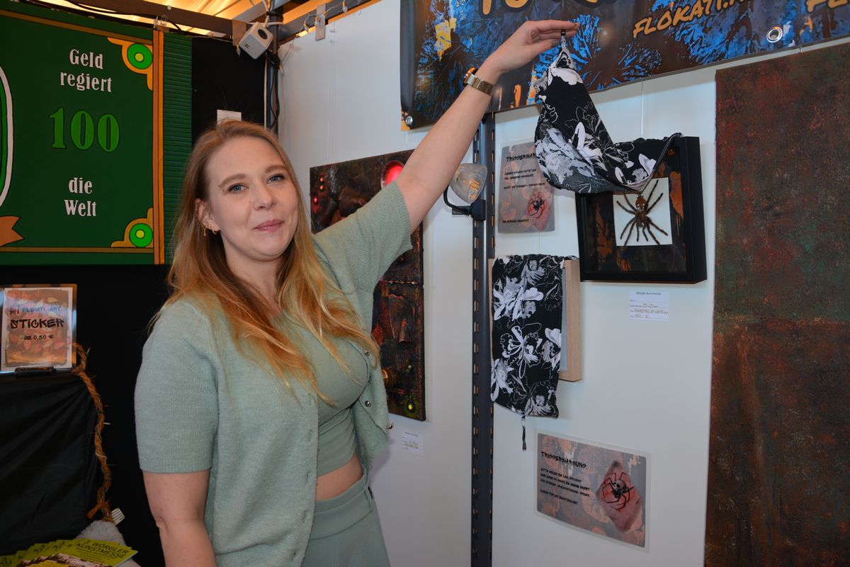 Bei Flokati.-Art gab´s auch Verhülltes: Weil letztes Jahr Messebesucher Angst vor Spinnen hatten, gab die Künstlerin heuer den Anblick erst nach Lüften des Tuches frei…