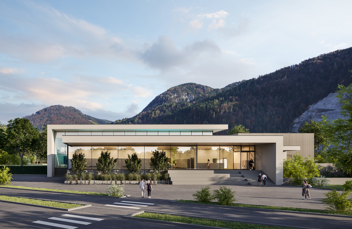 Präsentationsfolie von proWörgl: Ansicht des Eingangsbereiches bei einem Schwimmbad-Neubau.