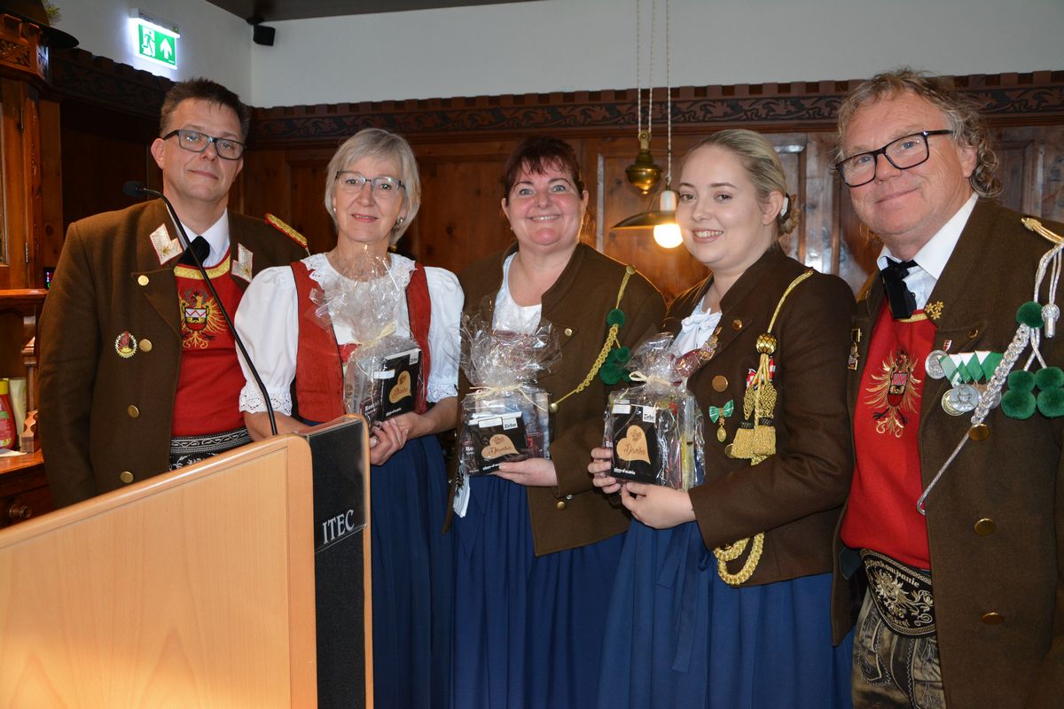 Ein Danke an die Marketenderinnen Margit Thomaset, Margaret Ager-Viebeg und Simone Schachner (nicht anwesend Franka Novak) – links Manfred Schachner, rechts Hauptmann Manfred Mohn.
