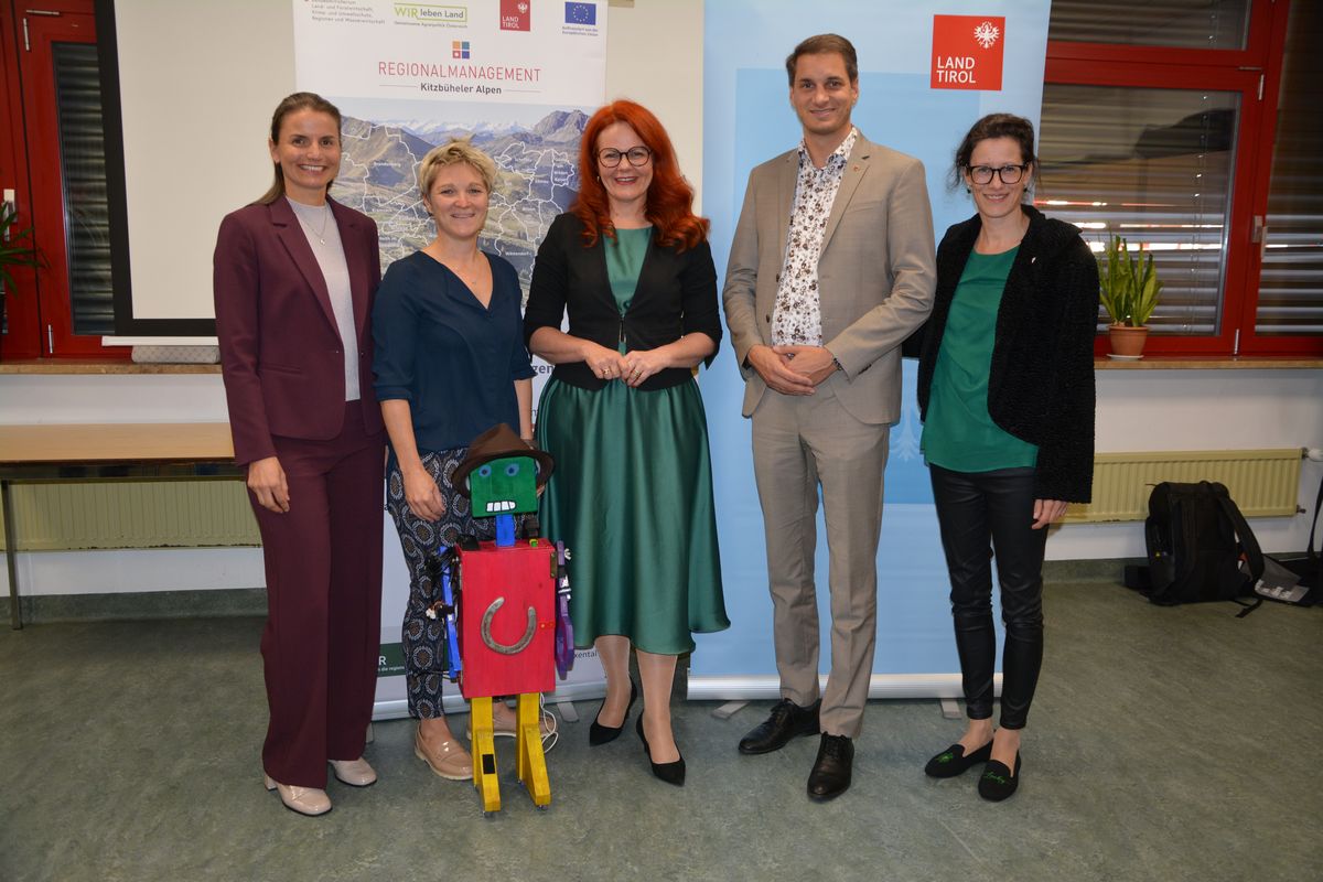 Bei der Eröffnung des STEAM-Lab in Wörgl (v. l.): Bettina Ellinger (Bildungsdirektion für Tirol), Elfriede Klingler (Geschäftsführerin Regionalmanagement Kitzbüheler Alpen), Bildungslandesrätin Cornelia Hagele, Michael Riedhart (Bürgermeister Stadtgemeinde Wörgl) und Sonja Altenburger (Obfrau Wirtschaftskammer Kufstein)