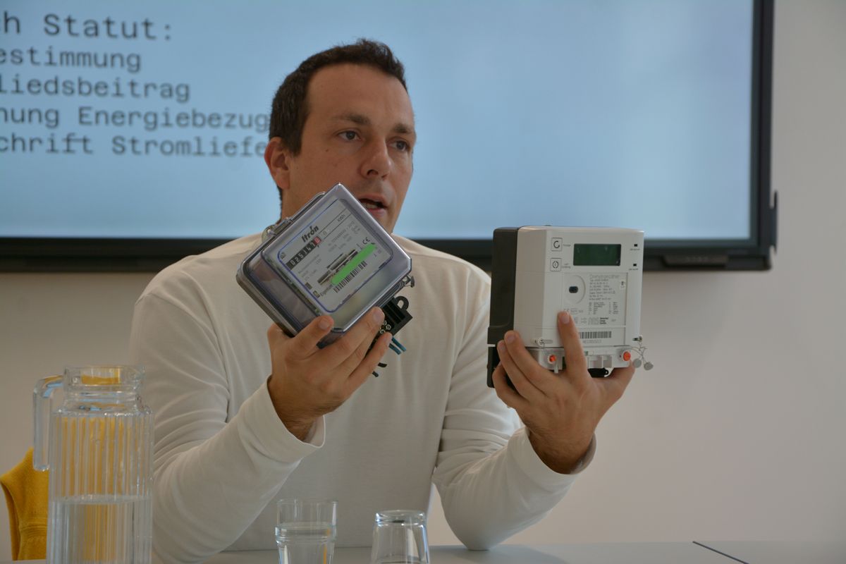 WEEG-Obmann Ing. Christian Kogler erklärt den Unterschied zwischen herkömmlichem Stromzähler und Smartmeter – letzterer ist Voraussetzung fürs Mitmachen bei der Erneuerbaren Energiegemeinschaft.