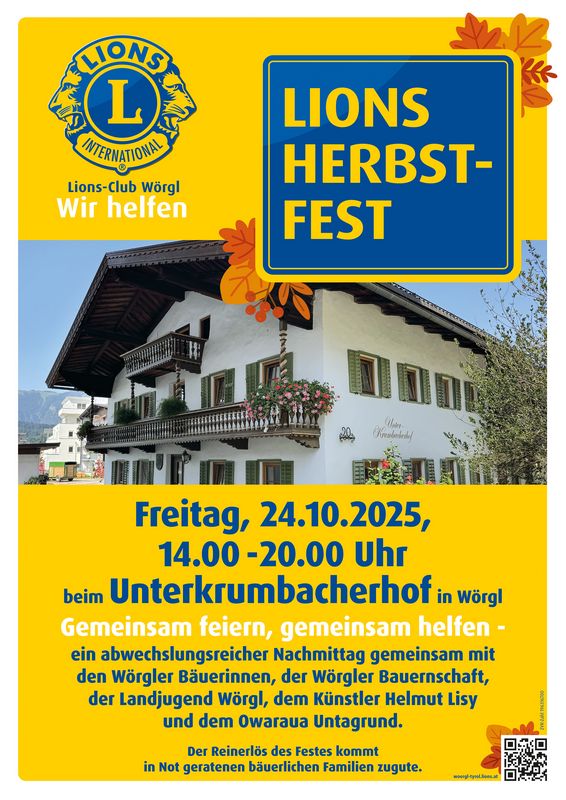 Der Lions-Club Wörgl lädt am Freitag, 24. Oktober 2025 gemeinsam mit den Wörgler Bäuerinnen, der Wörgler Bauernschaft und der Landjugend Wörgl zu einem stimmungsvollen Herbstfest beim Unterkrumbacher Hof mitten in der Stadt (gegenüber vom Stadtamt). Von 14-20 Uhr erwartet die Gäste ein abwechslungsreicher Nachmittag voller Genuss, musikalisch umrahmt vom „Owarauer Untagrund“.