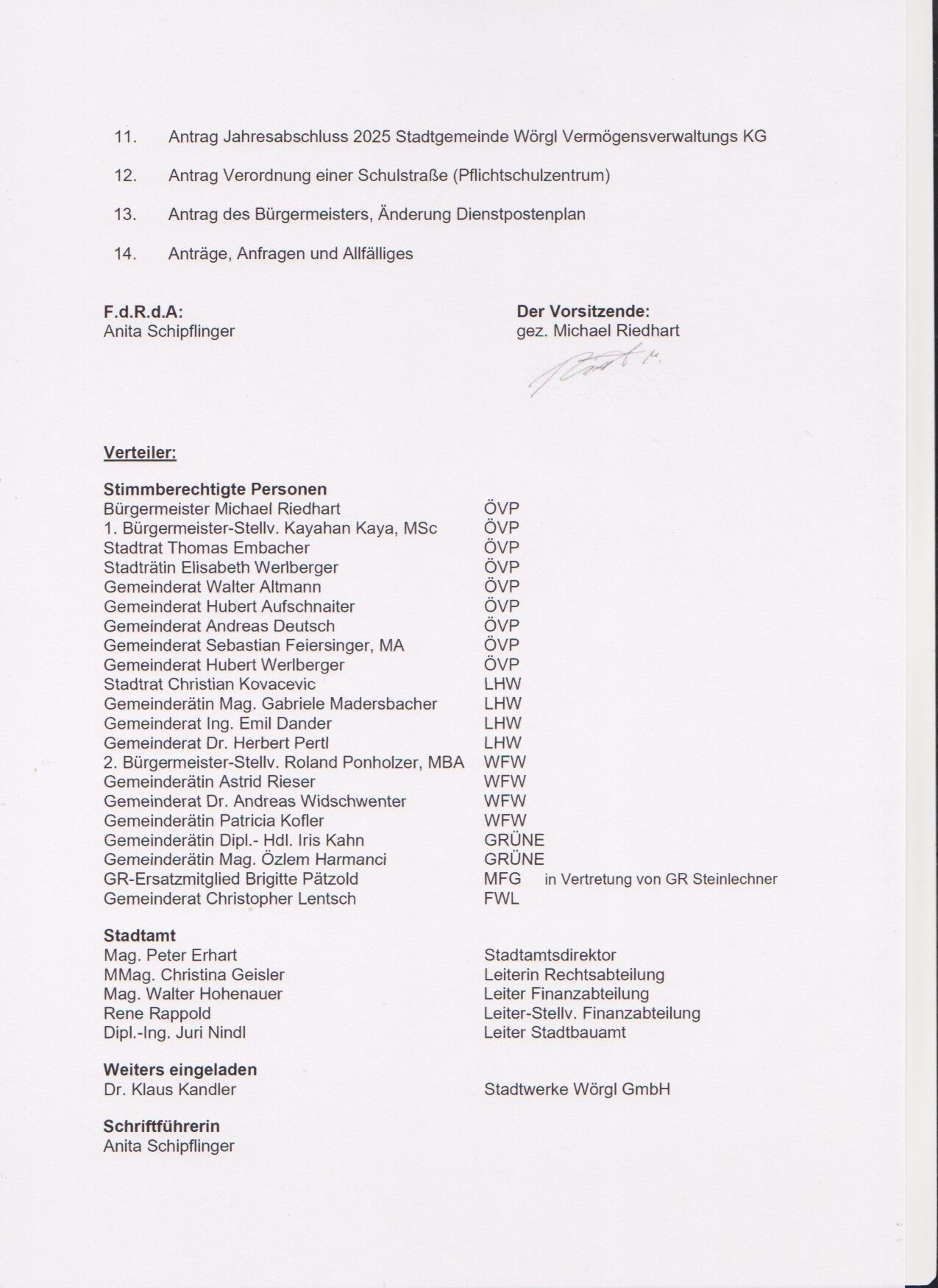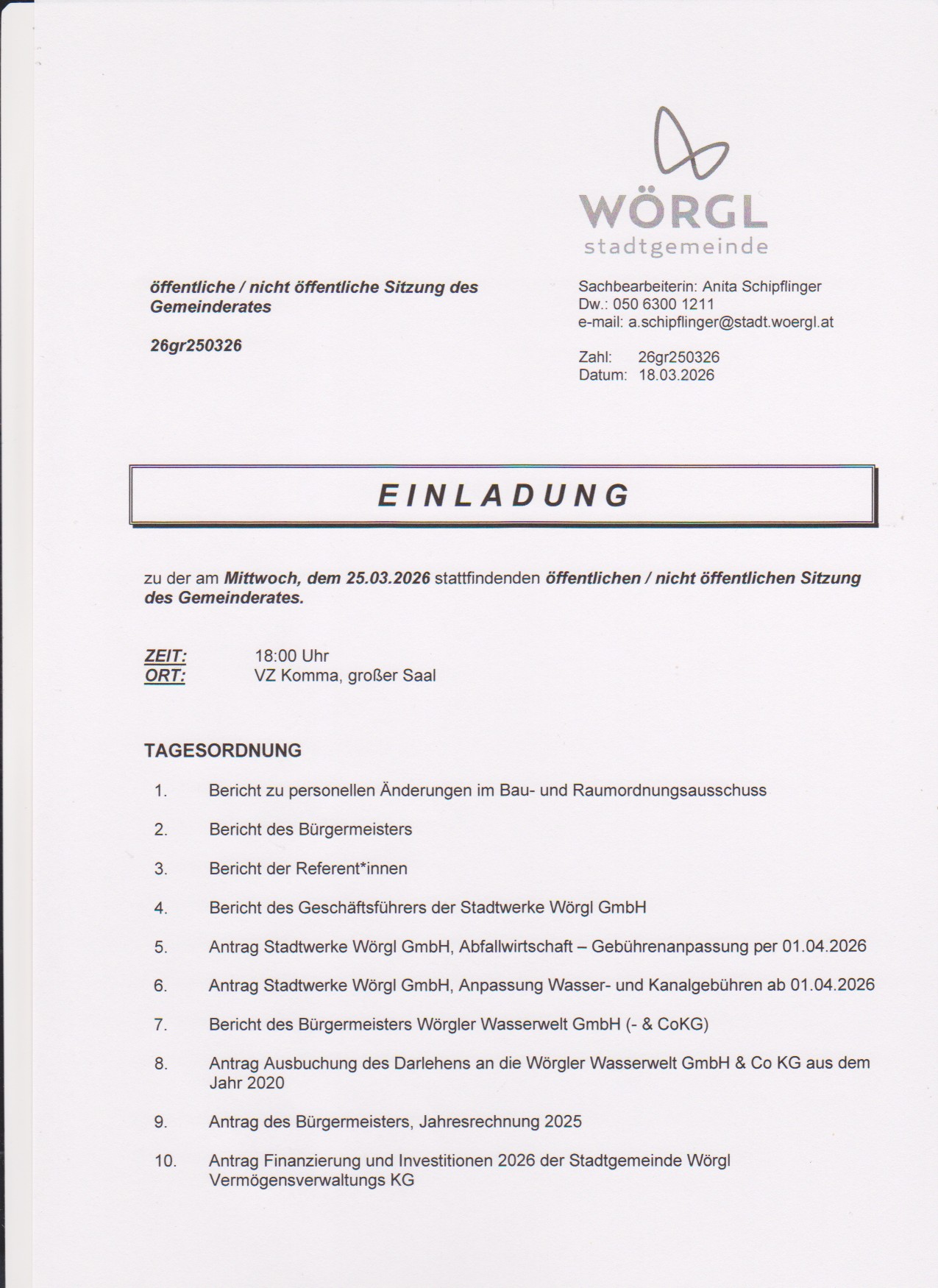 Die nächste öffentliche Sitzung des Wörgler Gemeinderates findet am Mittwoch, 25. März 2026 ab 18 Uhr im Veranstaltungszentrum Komma statt. Auf der Tagesordnung stehen neben dem Jahresabschluss Anträge auf Gebührenanpassungen bei den Stadtwerken, personelle Änderungen im Bau- und Raumordnungsausschuss, der Bericht des Bürgermeisters zur Wörgler Wasserwelt, die Verordnung einer Schulstraße sowie eine Änderung des Dienstpostenplanes. Die gesamte Tagesordnung lesen Sie hier: